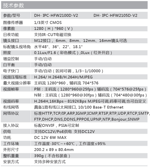 支持DC12V/POE供电(HFW2205B不支持POE供电)