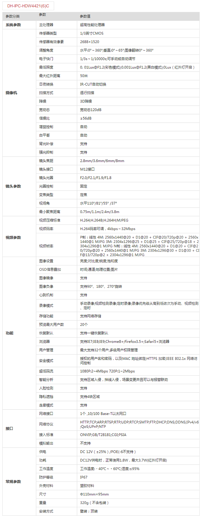 高清(400万像素)宽动态单灯网络摄像机 DH-IPC-HDW4421(6)C