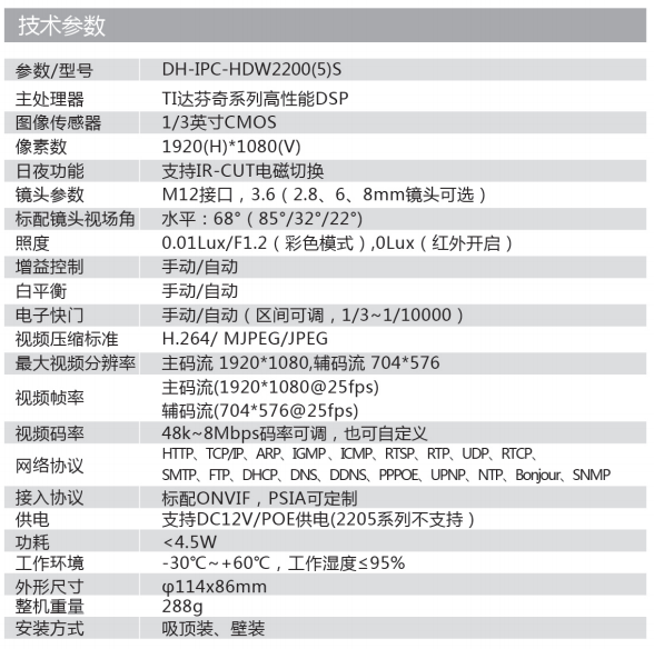 支持DC12V/PoE供电(HDW2205S不支持POE供电)